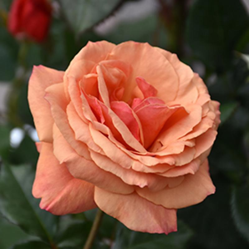 This variety, with a spicy, fruity fragrance produces a unique color combination of golden petals with a pink blush and bronzy reverses, above the deep green foliage; blooms on strong stems are perfect for cutting; excellent disease resistance