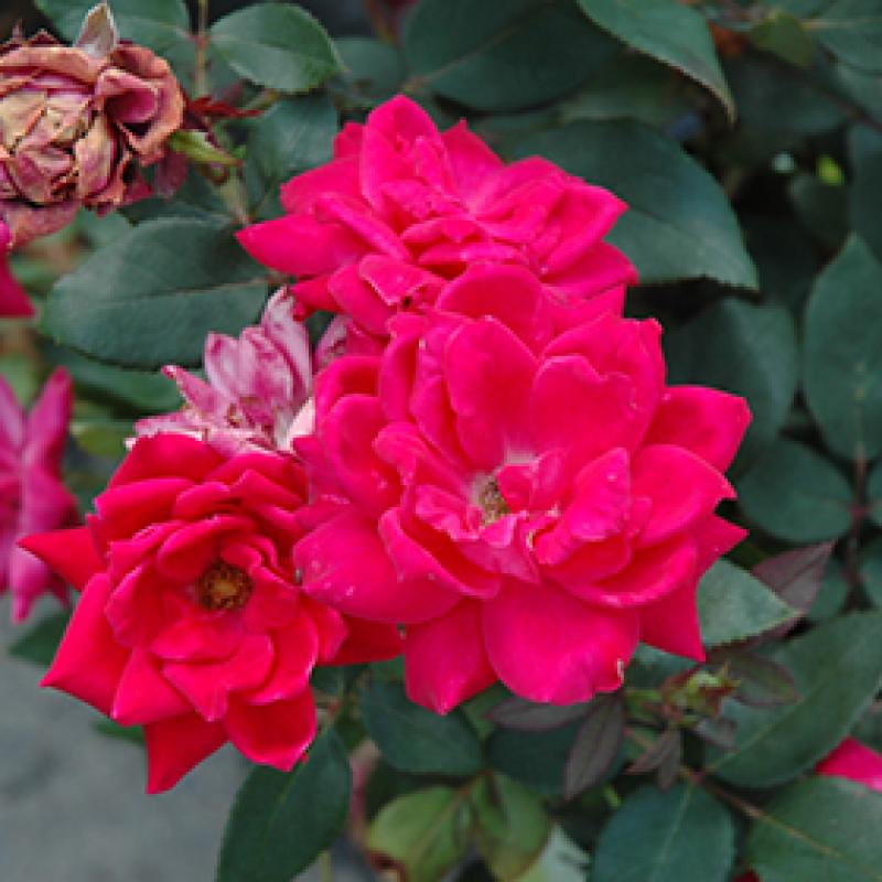 Plant this carefree landscape rose anywhere you need low shrubs and continuous color; a very low maintenance shrub great for along walkways or in the garden; cherry red blossoms and deep purple fall foliage provides your garden three seasons of interest