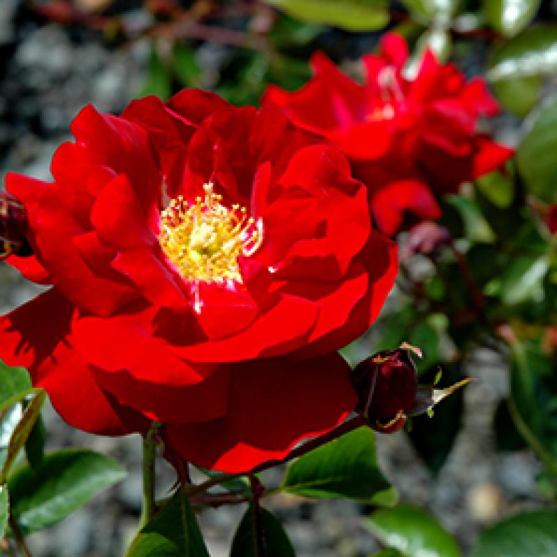 This vivacious variety produces clusters of flat semi-double crimson flowers with bright yellow eyes; robust foliage is dense, dark green and glossy; its spreading habit makes it perfect as a full sun groundcover for mass planting or for slopes