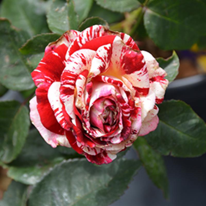 Exciting scarlet flowers streaked with cream and pink will stand out in your landscaping with this wonderful hardy and vigorous grandiflora; blooms up a storm throughout the season and will make a tremendous visual impact along walkways