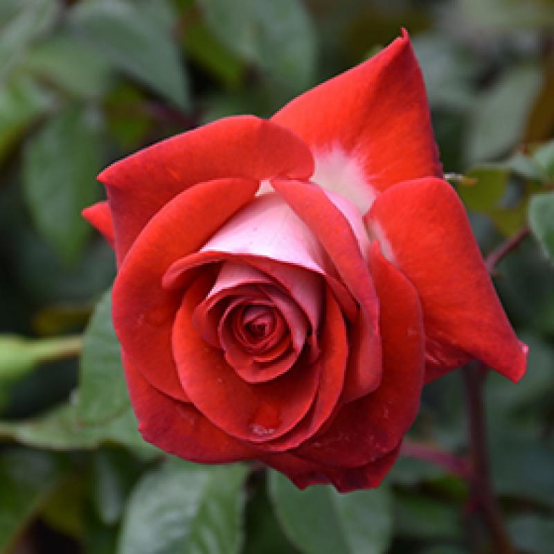 This sensual, orange-red rose has a smoky purple overlay and white reverses and is carried on a medium to long sturdy stem; should be deadheaded regularly and is an excellent cut flower; upright and vigorous habit