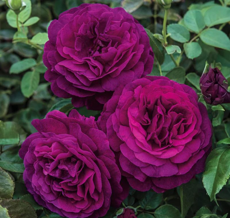 Big fat buds open to very double old-fashioned flowers of deep velvet purple overlaid with a wisp of smoke…a purple haze for the garden. Strongly scented with a combination of clove & lemony citrus blossom. Deep green leaves cover the plant & compliment the remarkably colored flowers. Tempting mysterious tones, seductive fragrance and old-fashioned form…it's a winner! More purple in moderate temps.