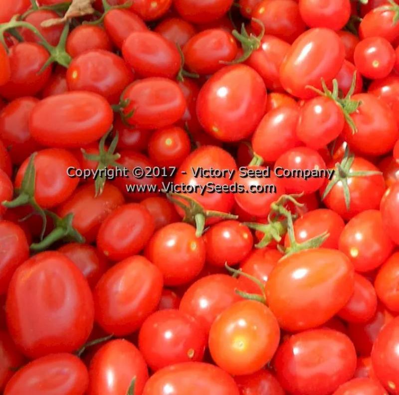 'Red Grape' fruit are bright red, weigh about one ounce each, and are generally smaller than most cherry-type tomatoes (½ by ¾ inches). Since they are mouth-sized, they are perfect for snacking, salads, and garnish plates. There are often twelve to sixteen fruit per cluster. This is a modern open-pollinated variety that has become very popular due to its excellent flavor and small, snack-sized shape. You have probably eaten these when you ordered a dinner salad at a restaurant or visited a salad bar.