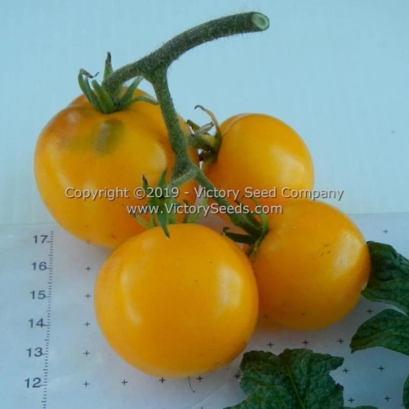 dwarf — The rugose, regular leaf plants of 'Dwarf Moby's Cherry' grow to about four feet high producing bright yellow to orange colored, slightly flattened globe shaped, one to two ounce cherry-type fruit. A tasty little salad or snacking tomato, its well balanced, delicious flavor, combined with its texture, makes it a perfect choice for grilling, salads and salsas.