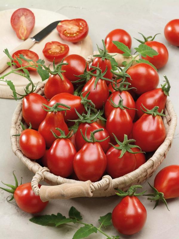 'Red Pear' fruit are a brilliant red color, typically weigh one-half ounce each, and as their name implies, are shaped like a pear. Caging or "sticking" the plants will be beneficial as they tend to sprawl all over the place and will be loaded with large clusters of fruit. Very similar to 'Yellow Pear' tomatoes, 'Red Pear' fruit make a very nice salad garnish or are perfect for snacking. Its history predates 1800 and it appears listed in many of the earliest seed catalogs.